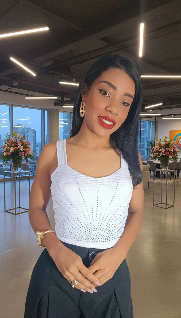 Com alças largas e modelagem que se ajusta ao corpo sem apertar, ela é perfeita para valorizar o colo e garantir conforto o dia todo. O brilho das pedrinhas adiciona um toque glam que faz toda a diferença — ideal para eventos, jantares, produções noturnas ou até para elevar o look básico do dia a dia.