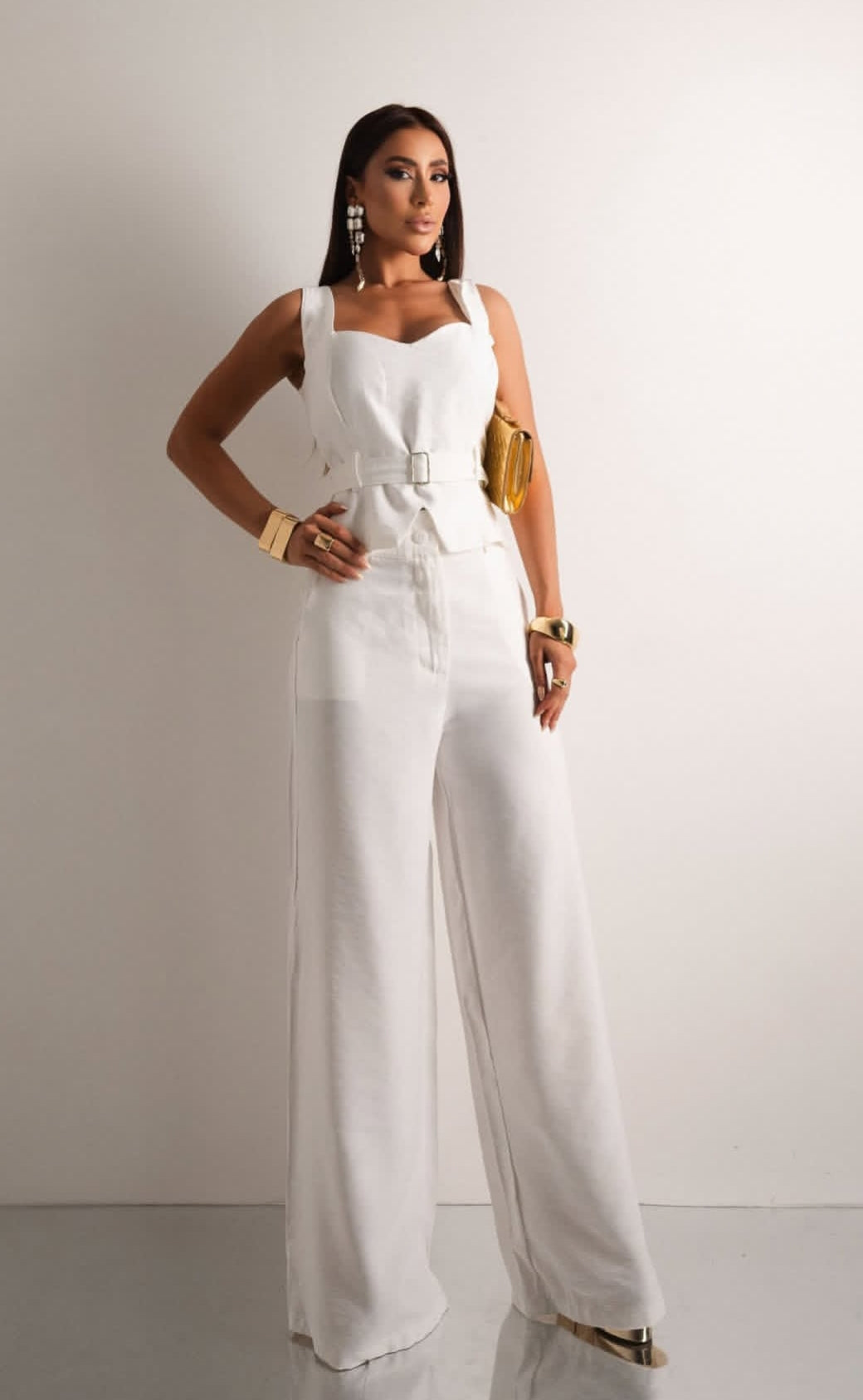 Conjunto sofisticado em alfaiataria, composto por calça de corte reto e blusa estruturada, com decote coração e cinto que deixa a sua cintura mais valorizada!