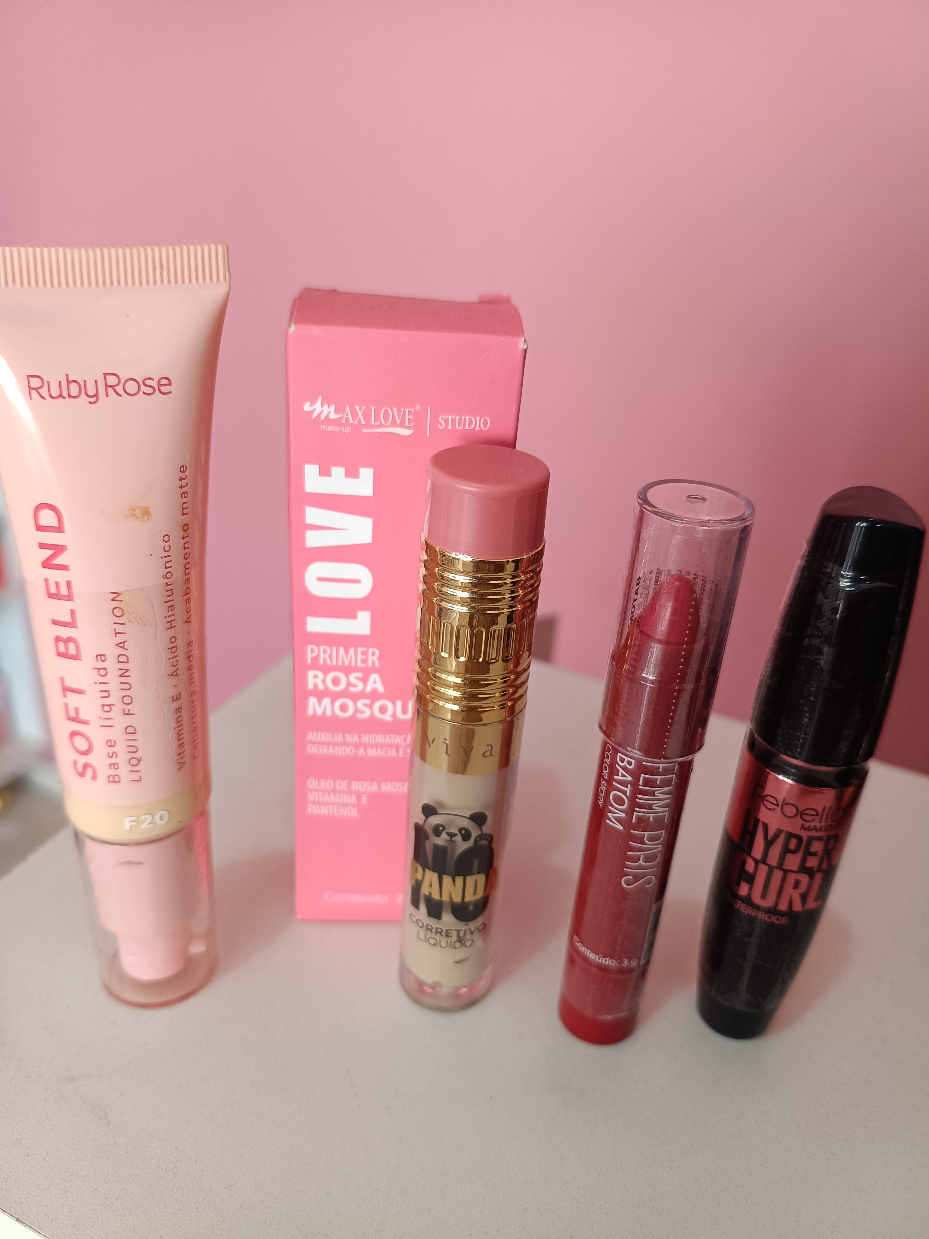 O primer prepara a pele com suavidade, garantindo poros minimizados e uma base impecável. A máscara de cílios entrega alongamento e volume instantâneos, destacando o olhar com intensidade. O batom lápis desliza com precisão, oferecendo cor vibrante e confortável por horas. O corretivo ilumina e cobre com naturalidade, enquanto a base uniformiza o tom da pele com alta performance e acabamento leve.