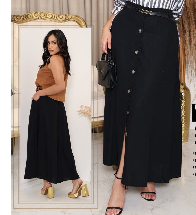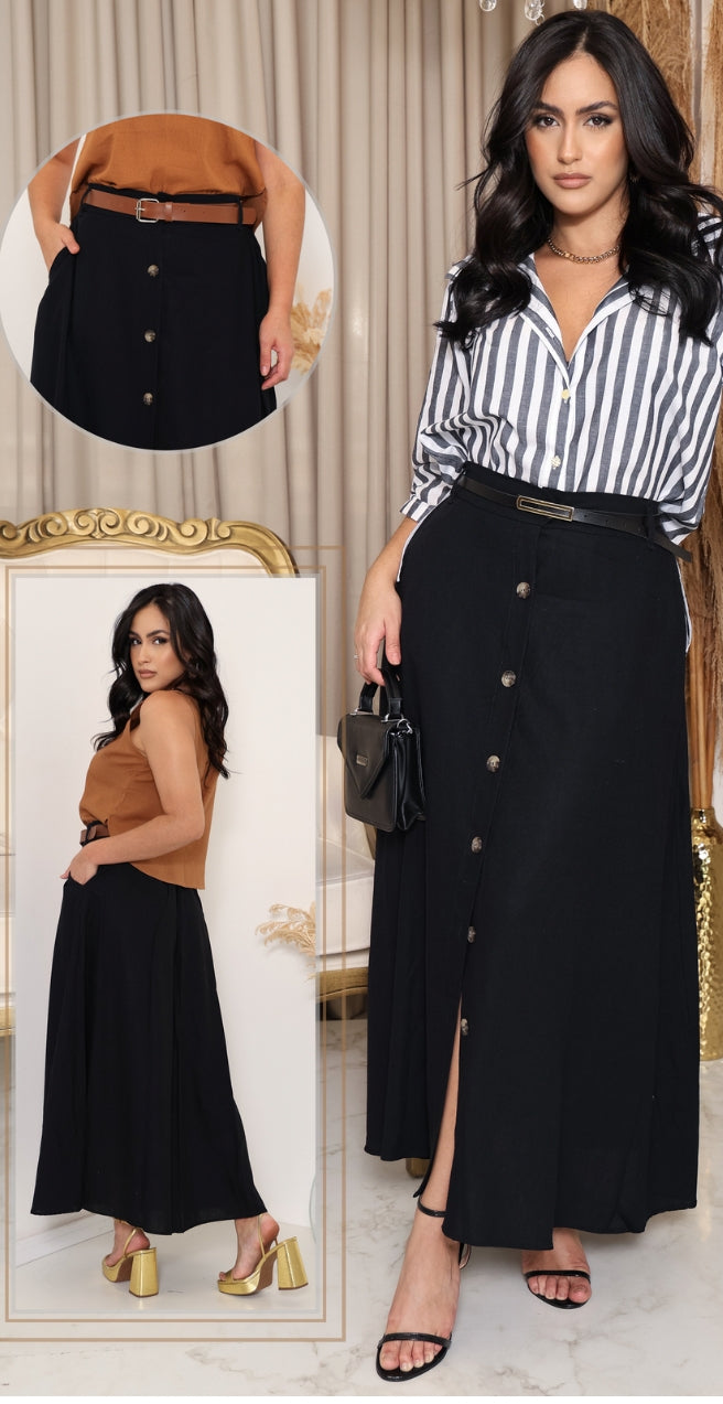 Nossa saia com botões frontais e cintura elástica é a peça perfeita para valorizar qualquer look Ainda possui bolso funcionais— leve, prática e cheia de charme.