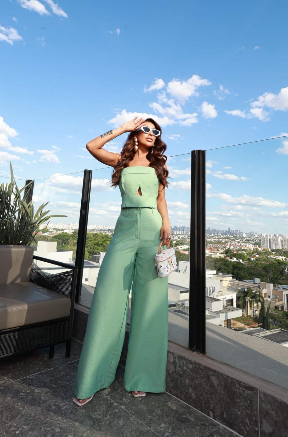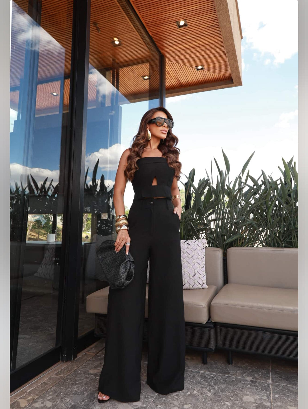 Conjunto sofisticado em alfaiataria, composto por calça de corte reto e blusa estruturada, confeccionados em tecido de toque macio e caimento impecável.